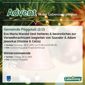Ort: Pfarrkirche Pöggstall - Eva Maria Marold liest heiteres & besinnliches zur Vorweihnachtszeit begleitet von Szandor & Adam Jaworkai (Violine & Cello)