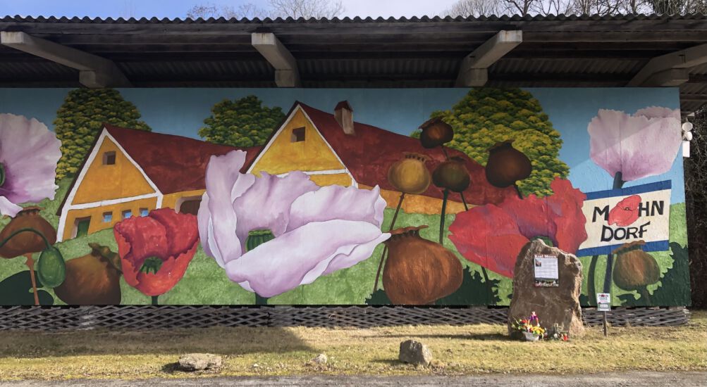 Wir starteten bei dem stimmig gelegenen Teichstüberl fröhlich los. Ein nicht allzu langer Marsch durch Wiesen und Wälder brachte uns bald in das allseits bekannte Mohndorf in Armschlag. Das war es also, das Mohndorf. Hatte ich mir irgendwie ganz anders vorgestellt, lebendiger und touristischer. Der Mohnwirt hatte Ruhetag und so konnten wir uns nur im Souvenirladen etwas umschauen. Doch bald war es mit der Ruhe vorbei, denn einige Busse trafen im Mohndorf ein. Das Gedränge der interessierten Ausflügler in dem Laden wurde uns alsbald zu viel und wir verließen wieder, gestärkt durch leckere Mohnzelten, den bekannten Ort.
