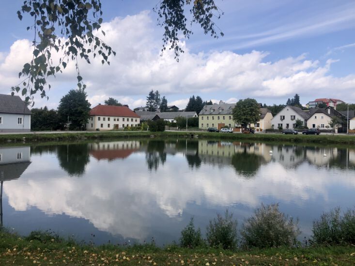 Wege und Straßen, stetig ansteigend, brachten uns schließlich an unser nächstes Ziel Ottenschlag. Ein lieblicher Ort, mit einem kleinen Teich, einem schönen stattlichen Schloss und einem alteingesessenen Kaffeehaus. Dort stärkten wir uns mit Cafe und Kuchen. Hier hatte ich das Gefühl, als wäre die Zeit etwas stehen geblieben. Auch die Kirche, wie alle die meinen Weg säumten, wurde besichtigt.