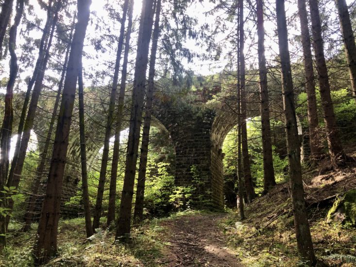 Der weitere Weg führte uns wieder durch viel Wald. Mitten drinnen versteckt das Viadukt, eine imposante Zugbrücke, bereits außer Betrieb. Vor fast zehn Jahren wurde der Schienenverkehr eingestellt. Ein sehr willkommenes Fotomotiv.