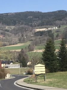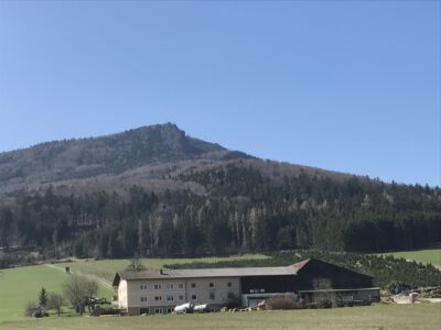 Von nun an gings bergauf Wir verlassen den im Sonnenschein liegenden Ort und sehen außerhalb sehr bald den “Kleinen Peilstein”, den wir ja heute bezwingen wollen, vor uns. Meine Enkeltochter Flora, die mich auch diesmal begleitet und ich dachten nicht an die Anstrengungen, die vor uns lagen, sondern genossen die herrliche Aussicht auf die sanften Hügel rund um Laimbach. Wegen der Fernsicht war es optimal, dass die Belaubung der Bäume noch nicht weit fortgeschritten war.