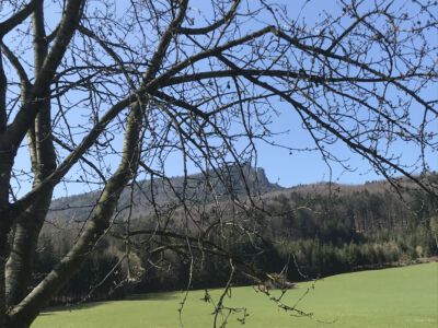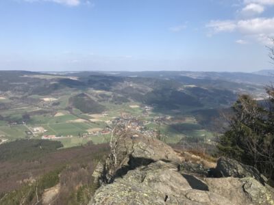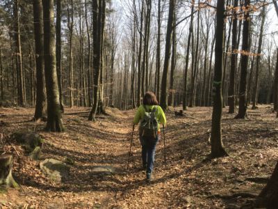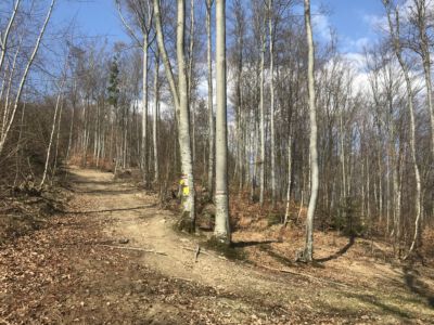 Die Wandersaison ist eröffnet Erstaunlich, wie viele Wanderer schon unterwegs waren und das ideale Ausflugswetter nutzten. Hier heroben findet man keine Fichten-Monokulturen, sondern Mischwälder mit vorwiegend dichtem Buchenwald mit teils mächtigen Bäumen. Ein gut ausgebautes und beschildertes Wegenetz zeigt uns den Weg zum Gipfel. Weiter oben teilt sich der Weg in eine “schwierige”und eine “leichte”Route, für die wir uns entschieden. Ich gebs ja zu, ich hatte manchmal ganz schön zu schnaufen und blieb dann wegen der “Landschaftsbetrachtungen” des öfteren stehen. Aber wir hatten ja keinen Stress!