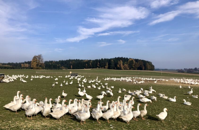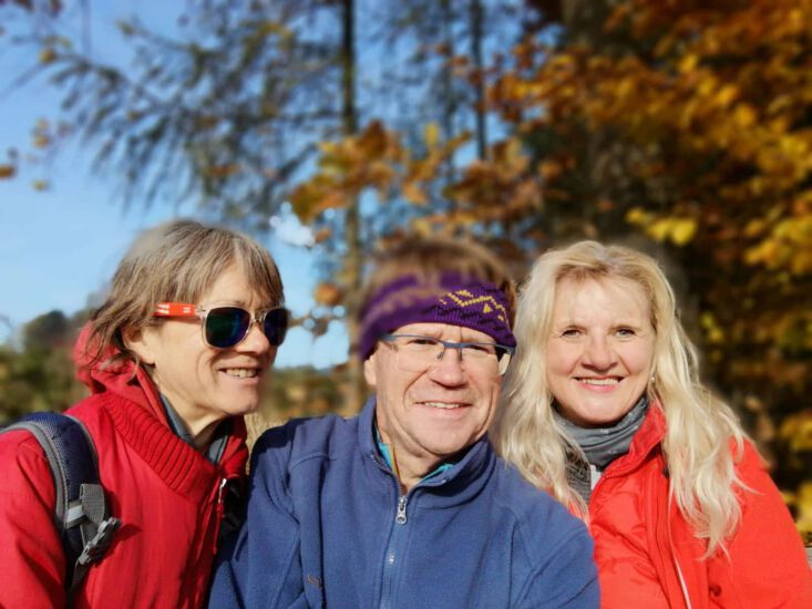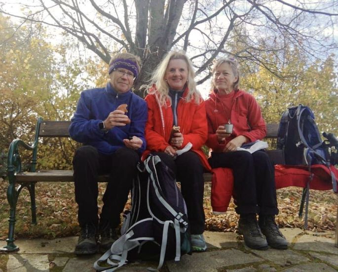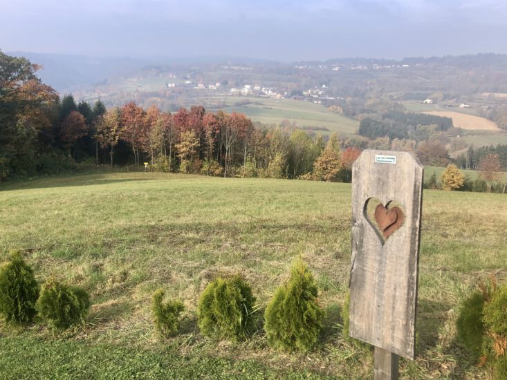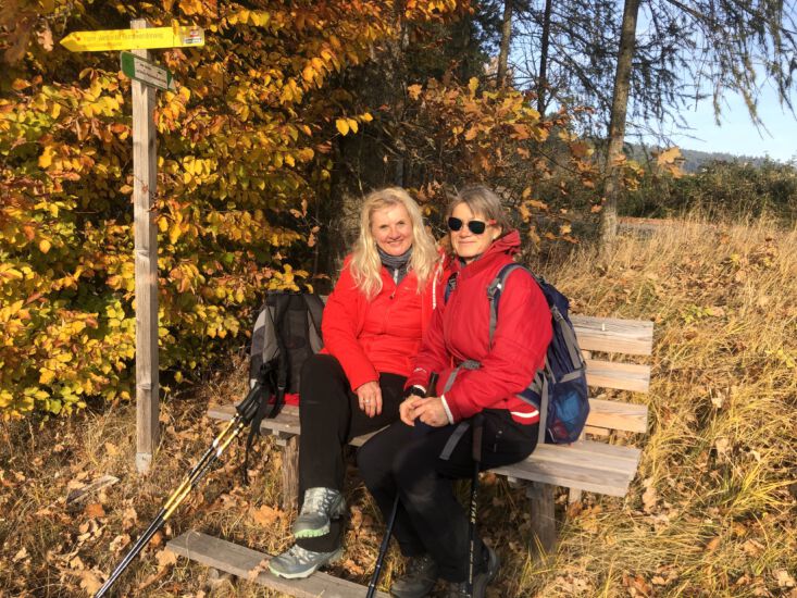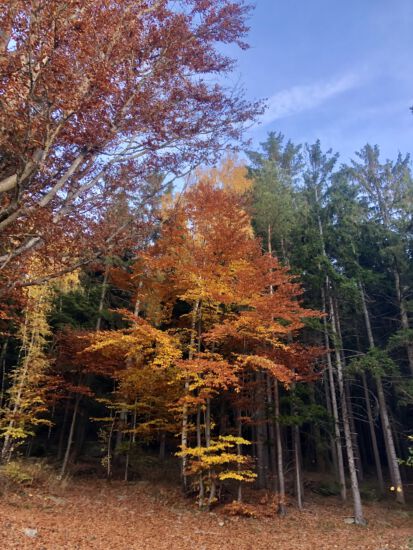 An einem sonnigen Herbstsonntag holte ich die beiden morgens ab. Unser Ziel war Maria Taferl, das wir auch recht bald erreichten. Sehr angenehm bergab führte uns anfangs der Weg und sehr lange war noch die schöne Basilika im Sichtfeld. Wir marschierten dann doch etwas steiler bergauf durch den Wald in Richtung Münichreith. Oben angekommen machten wir eine gemütliche Rast bei einem Marterl. Die mitgebrachte köstliche Wegzehrung wurde verschmaust. Weiter führte uns der ebene Weg vorbei an Feldern und an noch vielen glücklichen Martinigänsen. Es folgten einige kleinere zerstreute Ortschaften, mit sehr vielen Christbaumkulturen und wunderbar stimmig die Herbstlandschaft in den schönsten Farben. Danach marschierten wir bergab, bergauf teilweise entlang von Landstraßen und durch kleine Wälder in Richtung Laimbach. Obwohl das Ziel schon vor Augen, fühlte sich der Weg doch noch etwas lang an. Als wir das Etappenende in Laimbach erreichten, wurden Erinnerungen an meinen Lebensweg Beginn vor fast genau einem halben Jahr wach. Ach, wie froh war ich, dass ich den Peilstein bereits bezwungen hatte. Sein Gipfel leuchtete uns im schönsten sonnigen Herbstgold an.