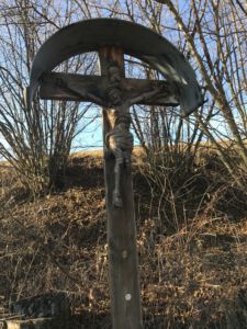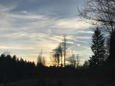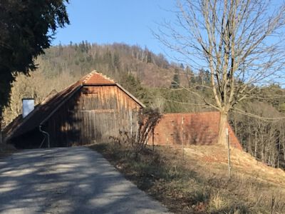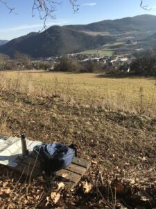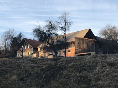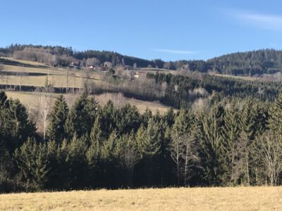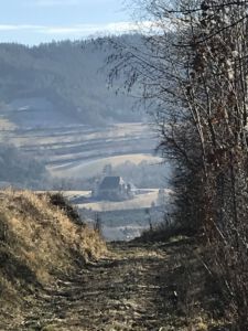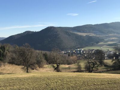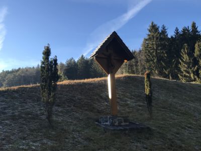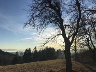 Außerhalb des Ortes, in dem rege Bautätigkeit herrscht, genehmige ich mir am Weg ein Häferl warmen Tee . Auf einem Bankerl in der warmen Wintersonne genieße ich den herrlichen Ausblick. Kleine Dörfer säumen den gut markierten Weg, nachdem ich den Wald verlasse, zeigt bald ein Wegweiser Richtung Aussichtswarte in Braunegg, die auch rund um die Landesausstellung entstand und weit bis in die Alpen blicken lässt. Nach einem kurzen Besuch im Abendrot bei “Ritter Jörg”, der lebensgroß die Anlage “bewacht” kehre ich noch im urigen Braunegger-Hof, Gasthof Fam. Mayer – Braunegg ein.