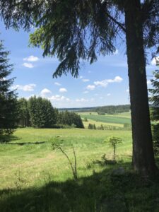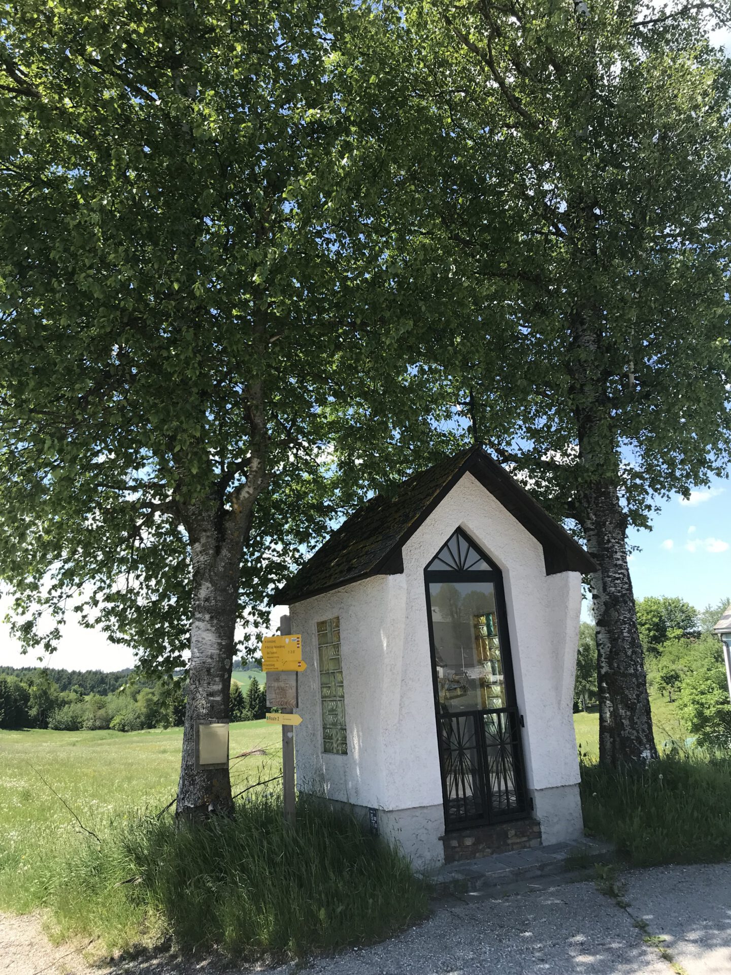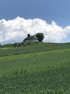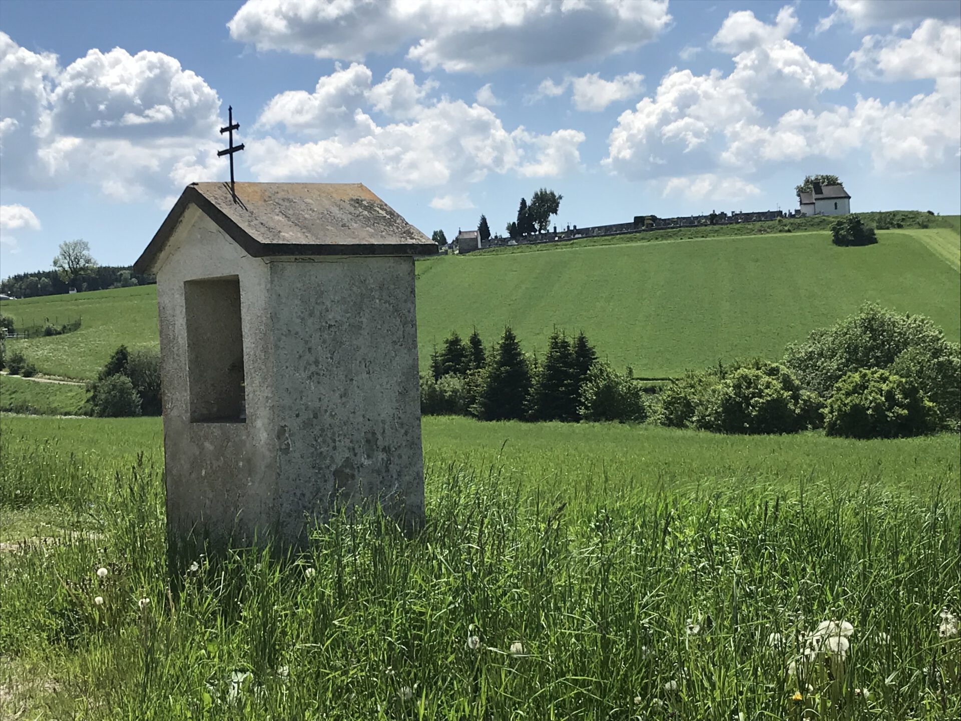 Nach diesem genussvollen Aufenthalt in einem traditionsreichen Gasthof am Lebensweg setzten wir unsere Wanderung nach Ottenschlag fort. Buchstäblich durch Wald und duftende Flur führt der gut markierte, gepflegte Weg über Hammerwerk und ein kleines Stück am Raxenbach entlang . Aus dem Wald rauskommend, entdeckt man bald hinter einigen sanften, blumenbestandenen Hügeln den auf einer Anhöhe gelegenen Friedhof und in weiterer Folge erspäht man einen Zipfel des Schlossturmes.