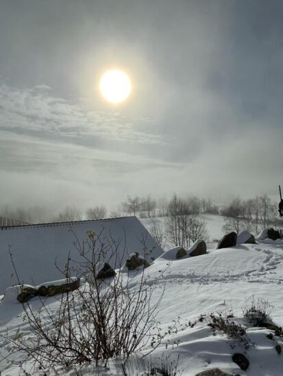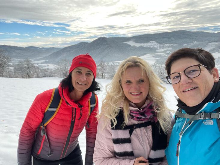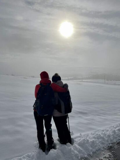 Somit starteten wir mit großer Freude in unseren Herzen los. Tiefster Winter war im Waldviertel eingekehrt und eine dicke, frische Schneedecke bedeckte das Land. Durch den unberührten Schnee zogen wir unsere Spuren durch die Wälder und Wiesen. Erschwerend kam jedoch noch dazu, dass die Wegstrecke sehr viele Steigungen hatte. Aber die herrliche Wintersonne ließ uns dies fast vergessen. Spurenmacherin Anita gab ihr bestes und ihr folgend erreichten wir nach einem längeren, nicht ganz unanstrengenden Marsch die Aussichtsplattform Braunegg. An diese wunderbare Winterstimmung die uns dort oben erwartete, werde ich noch sehr lange zurückdenken. Ein ganz besonderer Ort, der bestimmt auch im Sommer sehr einladend ist.