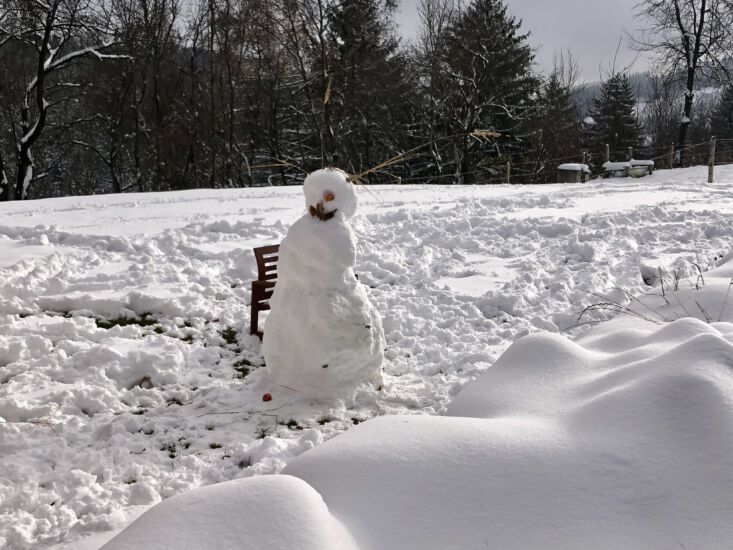 Danach erreichten wir das beschauliche Braunegg, sehr entlegen und irgendwie eine kleine eigene Welt. Ab nun ging es endlich wieder etwas bergab, vorbei an kleinen Gehöften und entlang an engen Landstraßen. Der erste Schneemann des Winters lachte uns entgegen. Wir kamen Raxendorf immer näher und etwas Wehmut überkam mich. Die letzten Kilometer meines Lebensweges waren angebrochen. Aber auch große Dankbarkeit, dass ich den langen Waldviertler Lebensweg geschafft hatte, immer in Begleitung von ganz besonderen Menschen.