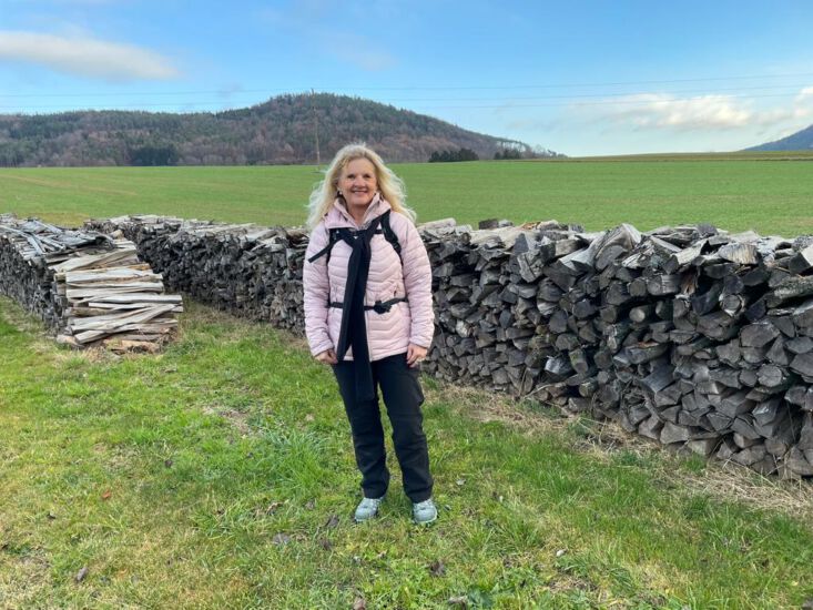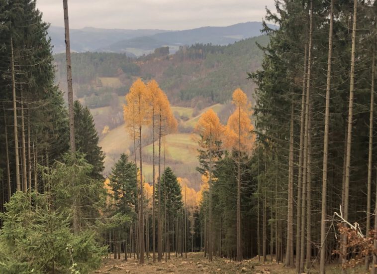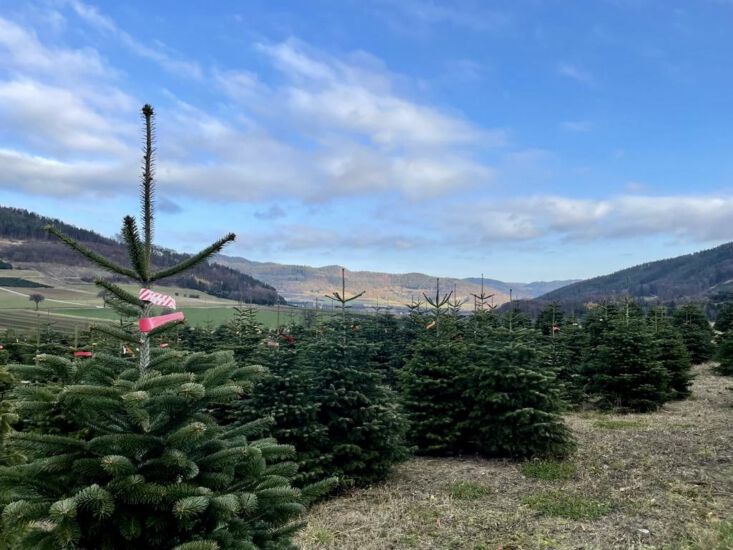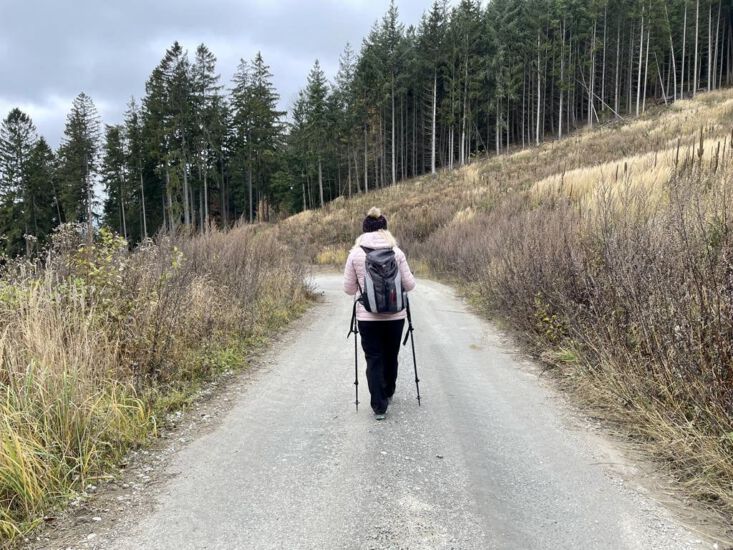 An diesem doch schon etwas kühleren Tag starteten wir, warm eingepackt, in Raxendorf los. Vorbei an unzähligen Baumkulturen, bereits mitten in den Vorbereitungsarbeiten für den Christbaumverkauf, marschierten wir sehr eben eine Weile gemütlich dahin. Danach folgte ein stetiger Anstieg in Richtung Nonnersdorfer Kreuz. Sehr nett hergerichtet ist dieser Aussichtsplatz und hier legten wir eine kurze Rast ein.
