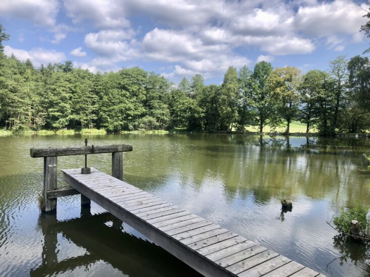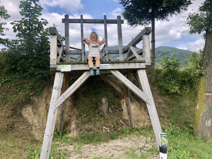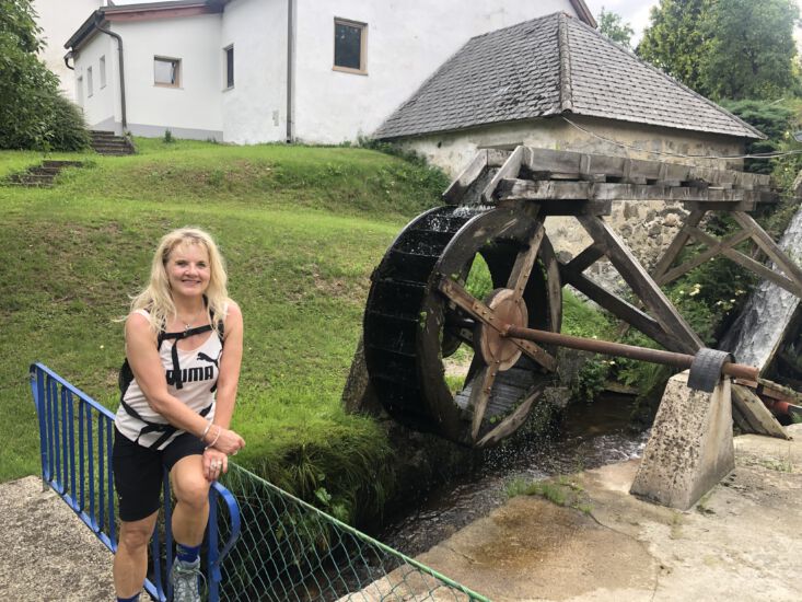 Bald danach brachen wir gut gesättigt auf. Ein schöner sommerlicher Tag lachte uns entgegen. Kurz nach Ysper bereits der kleine idyllische Puschacherteich. Einzigartig die vielen Seerosen und die verschlungene Vegetation. Ein langer Weg neben Landstraßen kam nun auf uns zu. Gerastet wurde auf einem überdimensionalen Sessel, der plötzlich im Nirgendwo vor uns stand. Winzig klein thronte ich dort hoch oben, aus der Sicht meines Begleiters. Sehr lange fühlte sich nun der Marsch auf den Feld- und Straßenwegen an. Dazwischen entdeckte ich ein schön restauriertes Mühlrad und die alte Perndlschmiede, die mich ganz besonders faszinierte. Bin ich doch sozusagen eine Schmiedemädchen, da meine Vorfahren, einschließlich mein Vater, alle Schmiedemeister waren.